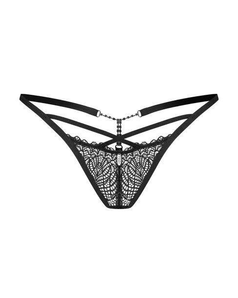 Elastyczna lamówka zapewnia idealne dopasowanie do sylwetki, a miękkie materiały gwarantują komfort noszenia. Delikatne koronkowe zdobienia dodają nuty kobiecości, podczas gdy srebrne łańcuszki i błyszcząca zawieszka z sygnetem Obsessive podkreślają luksusowy charakter bielizny.